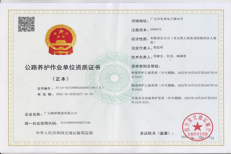 再添喜報!2023年2月16日,四川省交通運輸廳官網(wǎng)公布了《四川省2023年第一批公路養(yǎng)護作業(yè)單位資質準予許可名單》,廣元路橋集團有限公司位列其中。至此,廣元路橋集團有限公司成功獲得路基路面甲級、橋梁乙級、交通安全設施、隧道乙級4項公路養(yǎng)護作業(yè)資質,成為我市第一家、也是唯一一家取得上述公路養(yǎng)護作業(yè)資質的市屬國有企業(yè)。