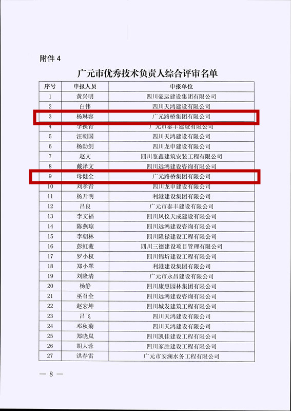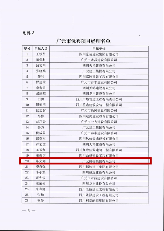 2023年7月1日,廣元路橋集團有限公司被廣元市住房和城鄉建設局評為優秀建筑企業;陳文輝被評為“廣元市優秀項目經理”;母健全、楊琳容被評為“廣元市優秀技術負責人”。