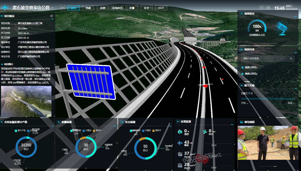 為強化風險管控,黑曾路項目部引入智慧信息化可視管理平臺,綜合運用BIM、GIS、物聯(lián)網(wǎng)、大數(shù)據(jù)、人工智能、無人機等先進技術,構建基于BIM+GIS+IOT+AI+PM的智慧工地平臺,實現(xiàn)進度、質量、安全等全方位智能化管控。