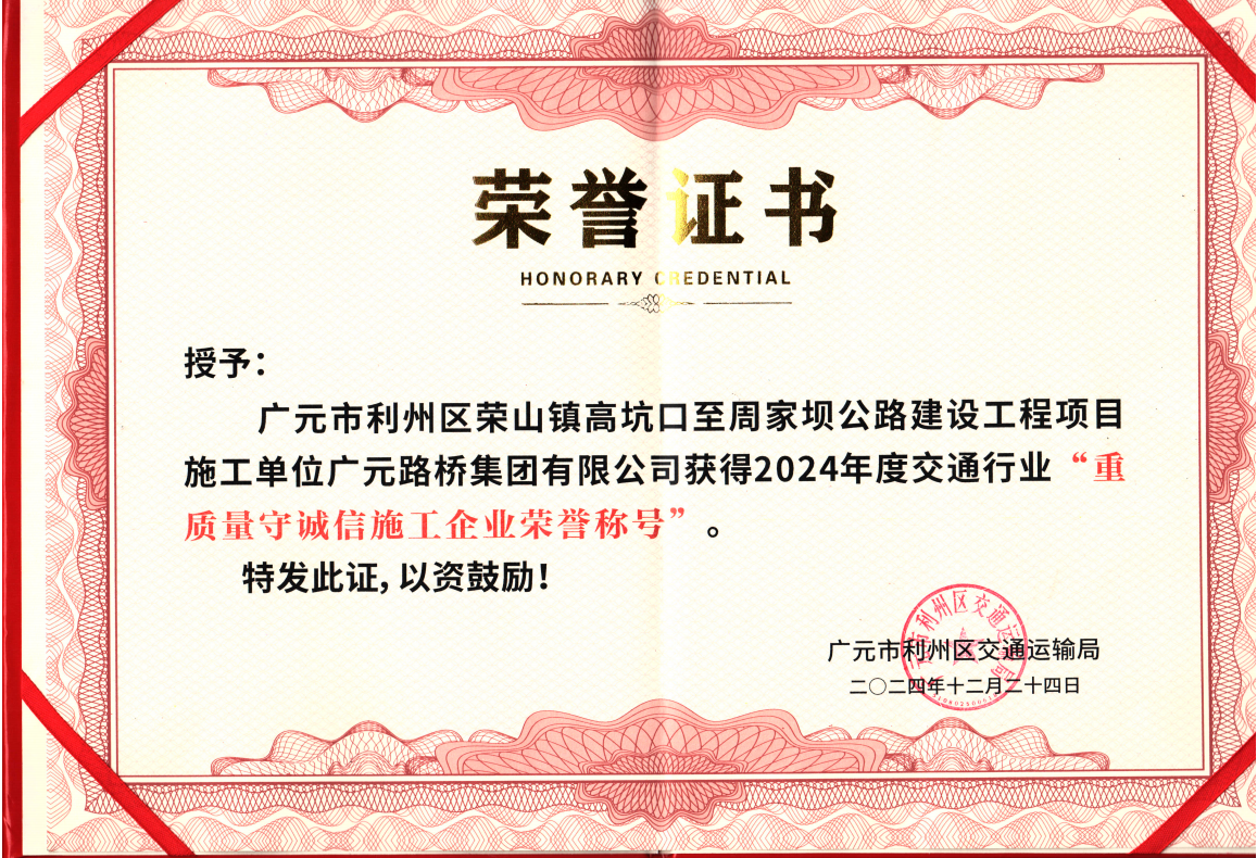 2024年12月24日,路橋集團受到利州區交通運輸局表揚,榮獲“2024年度交通行業重質量守誠信施工企業”榮譽稱號,路橋集團榮山鎮高坑口至周家壩項目部在工程建設全過程中,始終以認真細致、嚴謹高效的工作態度完成各項施工任務,以實際行動詮釋“重質量、守誠信”的精神內涵。